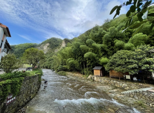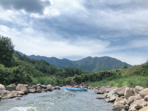群山環(huán)抱,溪水清澈見底,漂流途中兩岸山林連綿起伏,郁郁蔥蔥,