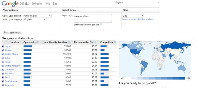 全球商機(jī)洞察可以提供來自全球互聯(lián)網(wǎng)搜索的數(shù)據(jù)。按照總的搜索量、建議出價(jià)和競(jìng)爭(zhēng)狀況對(duì)每個(gè)市場(chǎng)的商機(jī)進(jìn)行排序。