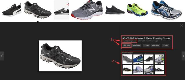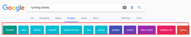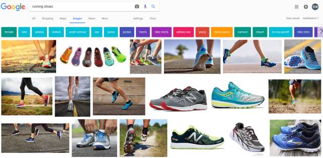輸入“running shoes”,就會(huì)出現(xiàn)各種跑鞋,眼花繚亂。往下看在圖片結(jié)果的上端出現(xiàn)了一條不同顏色的單詞條,這是Google推薦的篩選細(xì)分類目。