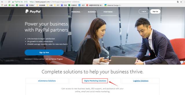打開(kāi)PayPal英文版官網(wǎng),在“Digital Marketing Solutions(營(yíng)銷(xiāo)推廣)”中便可找到外貿(mào)牛的官網(wǎng)入口。未來(lái)雙方將在營(yíng)銷(xiāo)推廣、市場(chǎng)優(yōu)化、用戶服務(wù)等多方面展開(kāi)廣泛深入合作,為中國(guó)的廣大外貿(mào)企業(yè)構(gòu)建“出?!睒蛄骸?/span>